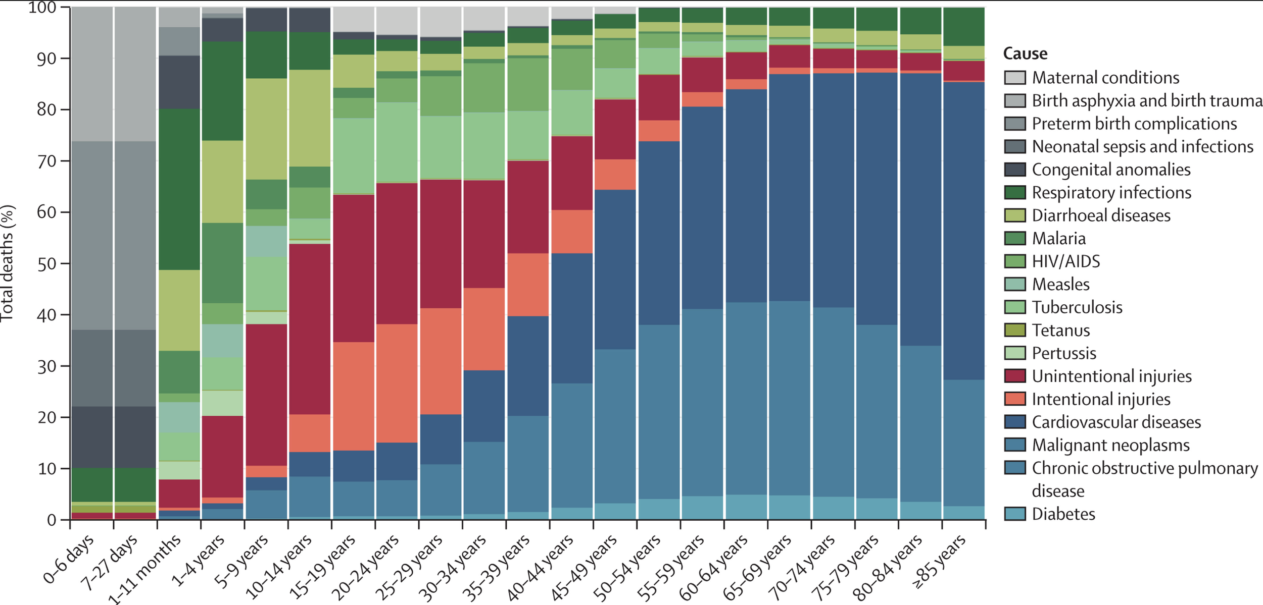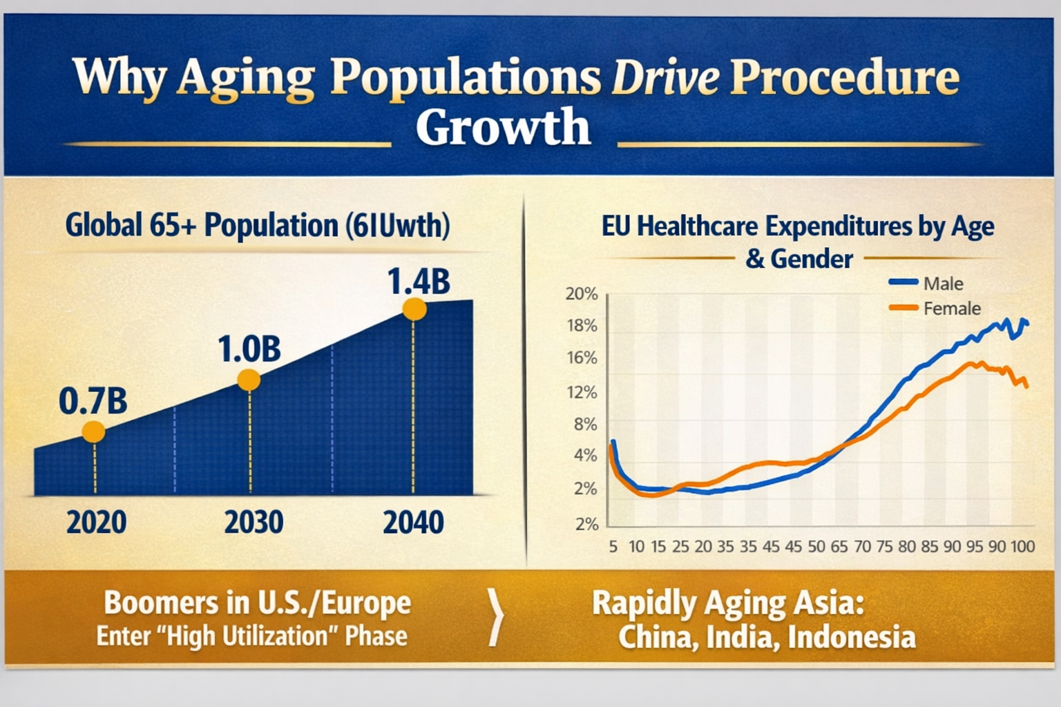 The above image shows the percentage of deaths due to a particular cause from birth and we want you to focus on the 60+ age group onwards. The leading causes of death are due to cardiovascular disease, Respiratory disease and malignant neoplasm. Also data shows that people start to access healthcare more often after they reach the age of 60. You can see this on the slide below which shows healthcare expenditures by age in EU. Not only that the countries with biggest populations like China, India and Indonesia is also rapidly ageing.