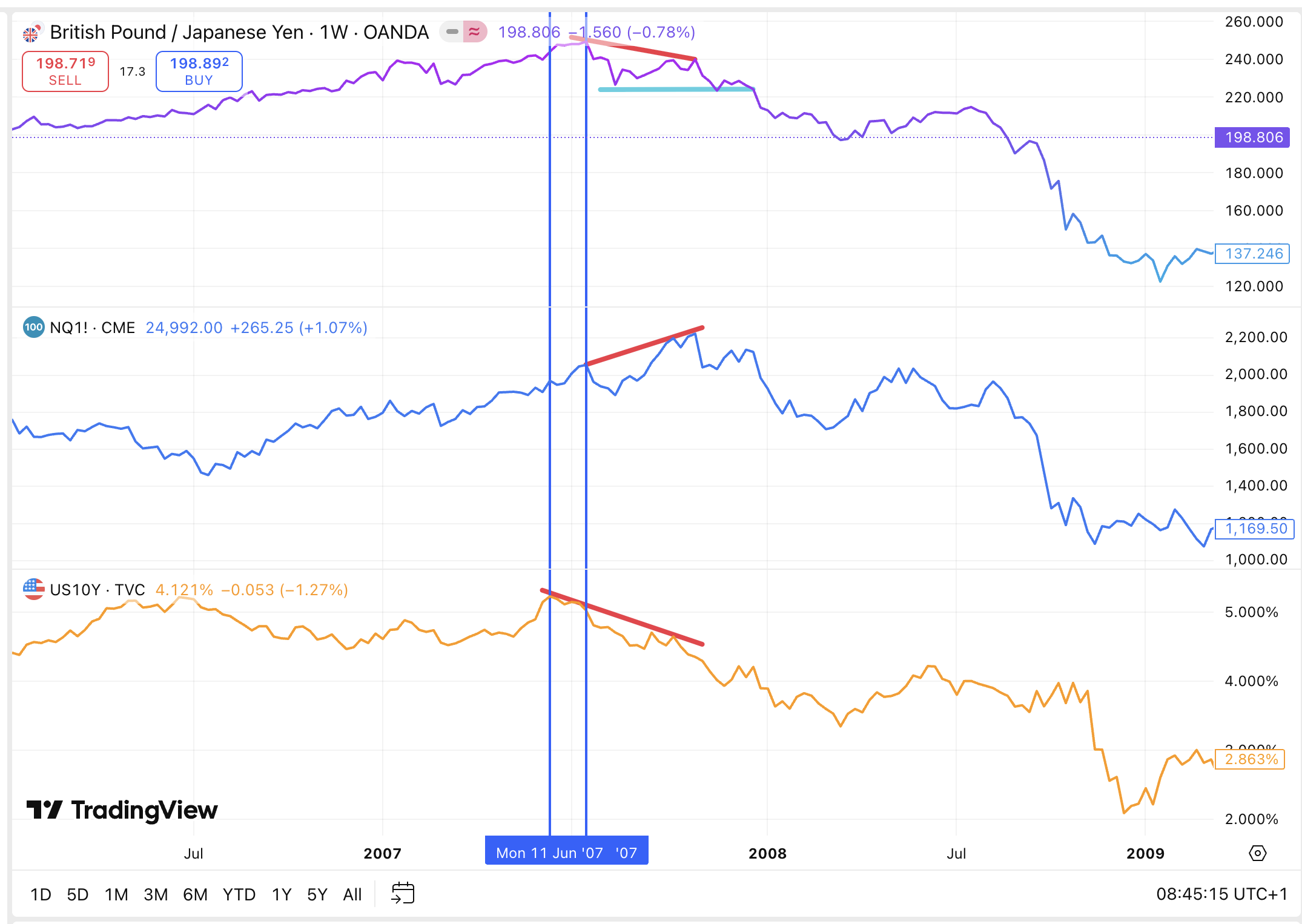 Recent charts of the British Pound/Japanese Yen (GBP/JPY), the Nasdaq 100 futures (NQ), and the US 10-Year Treasury yield (US10Y) tell a familiar story—one that echoes powerfully from the 2007-2008 financial crisis.
