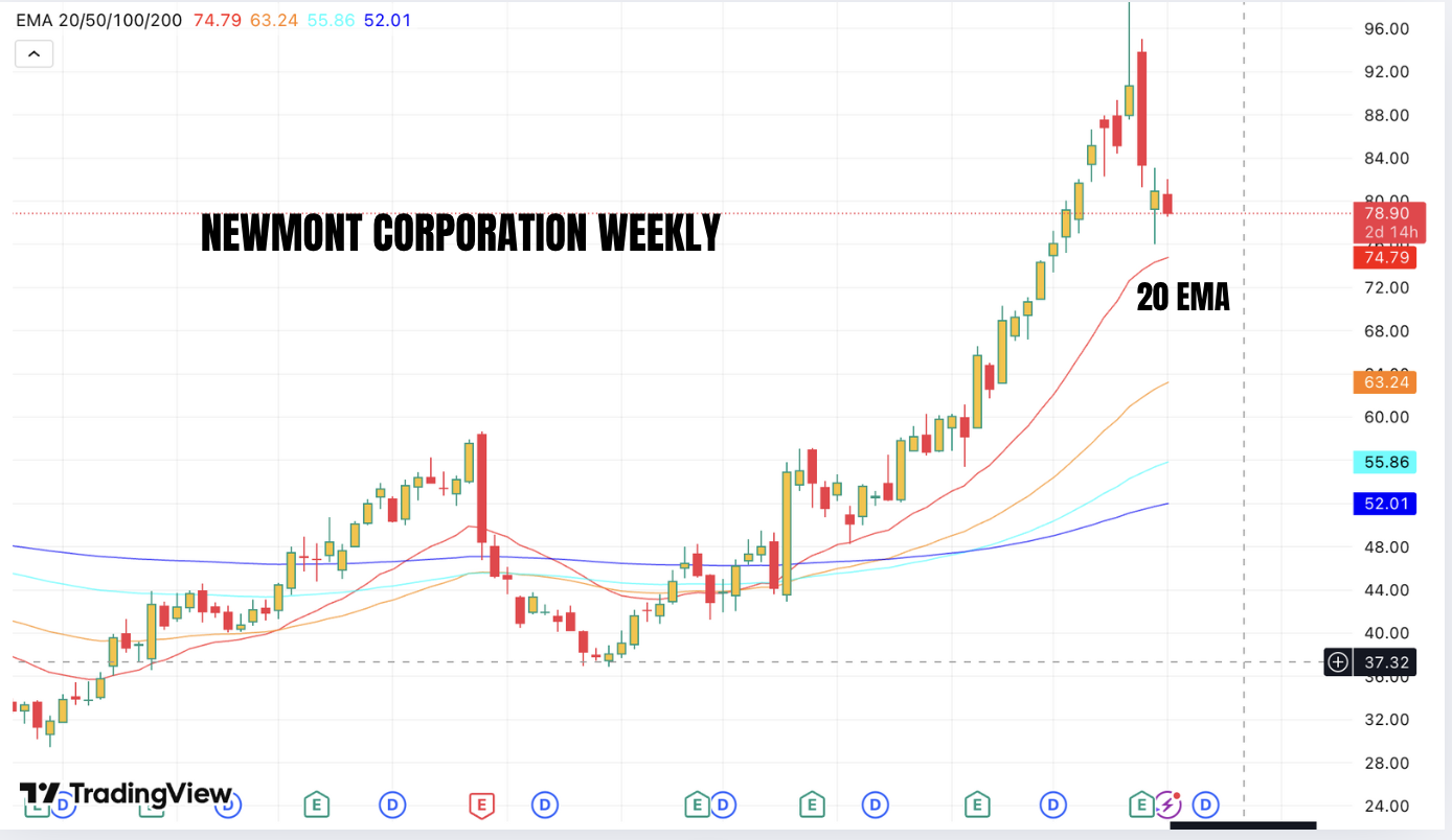 The above chart compares the 3 biggest and strongest miners and streamers. WPM is a royalty company and is showing relative weakness even though previously it had been strong. Agnico Eagle is the strongest as its AISC is lower compared to Newmont. But Newmont will give asymmetric exposure to rise in gold prices as it has much higher production than Agnico Eagle. We will initiate longs in the model portfolio at the time the gold reached $3850 or if the individual weekly chart of each of the come to their respective 20 week EMA. WPM has already touched its 20 week EMA but as it is the weakest we will wait for Newmont to touch its 20 week EMA to buy both WPM and Newmont in oue model demo portfolio.