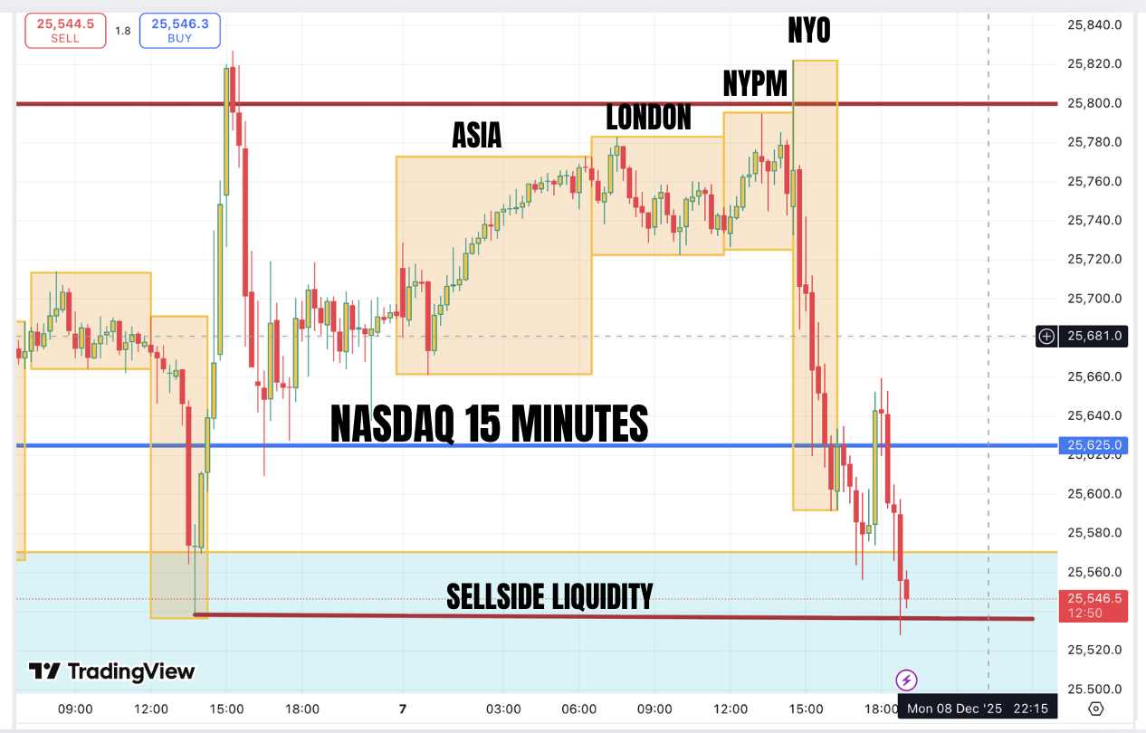This is the 15 minute chart of Nasdaq on Monday 08/12/2025. The Nasdaq was bullish on the weekly and daily basis. However this week we have FOMC on wednesday and NFP (delayed) on Friday. We expected a level of retracement to take internal range liquidity. Also if we look at the price delivery, there was a larger market maker buy model in play. Last week there was lot of back and forth action. This suggested accumulation to me. So we expected a liquidity raid before a move higher.