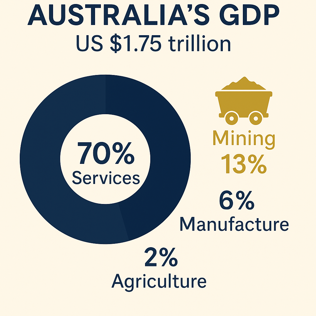 Australia is the 6th largest country in the world with a population density of 4 people/Km2. The GDP is of Australia is $1.75 trillion and is the 13th largest in the world with an annual growth rate of 1.8%. The median age of the population is 38 years. The above image shows the distribution of the GDP across different sectors. The per capita GDP of Australia is higher than that of the UK.