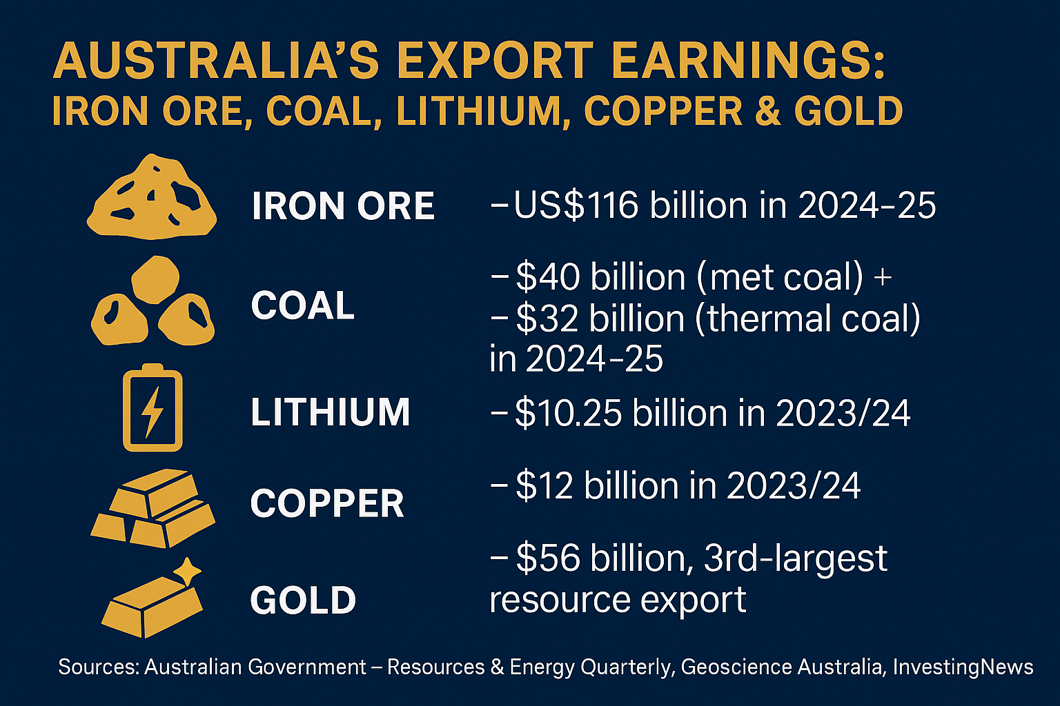 1. Iron Ore — Australia is the world’s largest exporter, supplying over 35% of global seaborne trade, primarily to China, Japan, and South Korea.