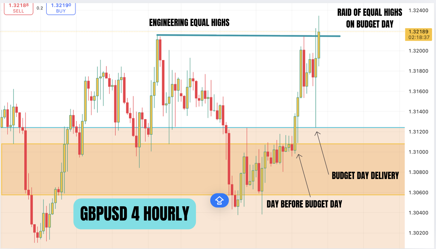 see on the day before the budget, the price moves aggressively in the new york session but the price stops just before taking the recent highs. This is engineering of liquidity and makes people think that there is resistance above that area. But this is a trap set by the Market makers. As the market makers now move the market down, it will induce retail traders to take short positions on GBPUSD.